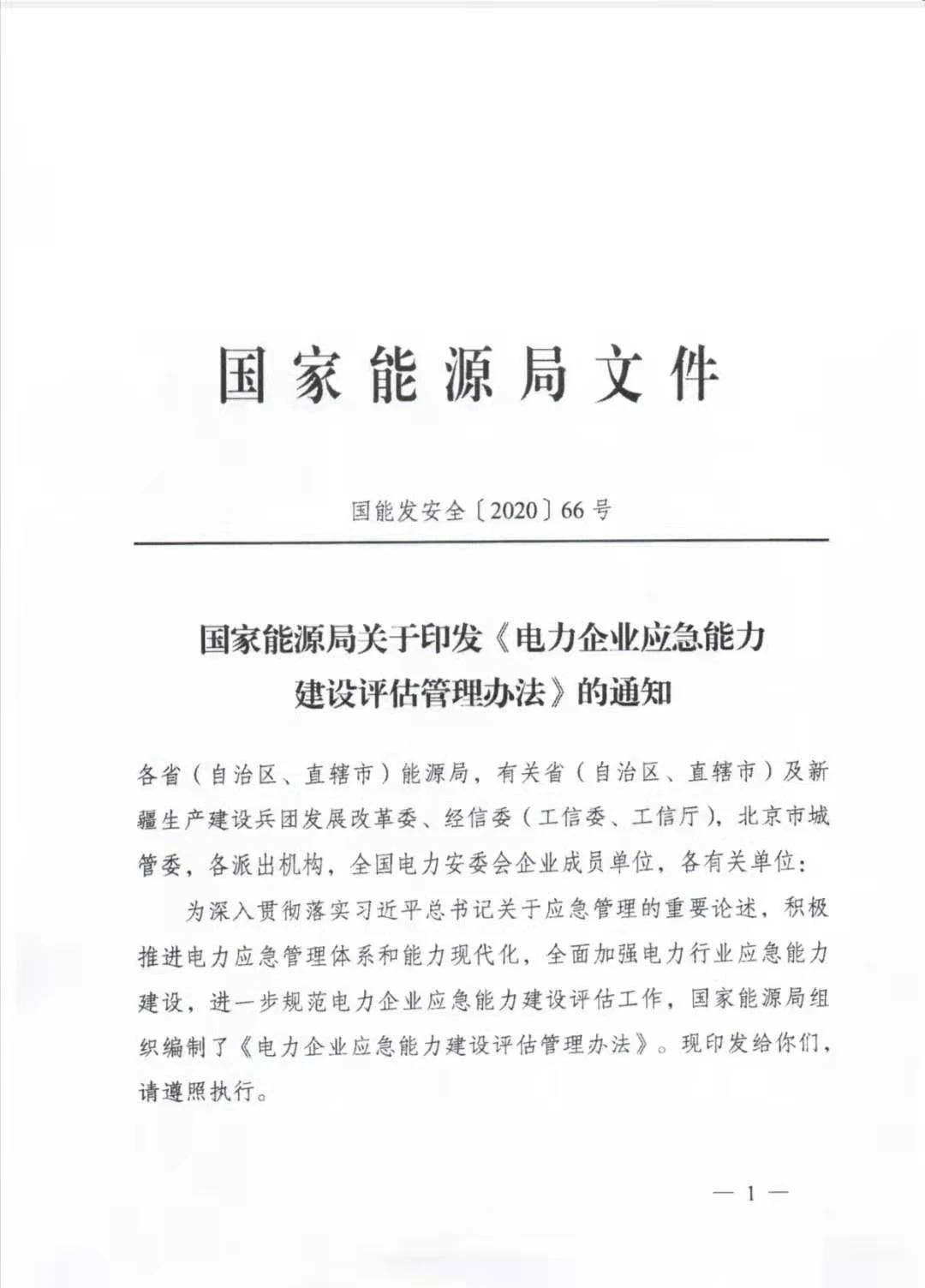 國家能源局印發(fā)《電力企業(yè)應(yīng)急能力建設(shè)評(píng)估管理辦法》