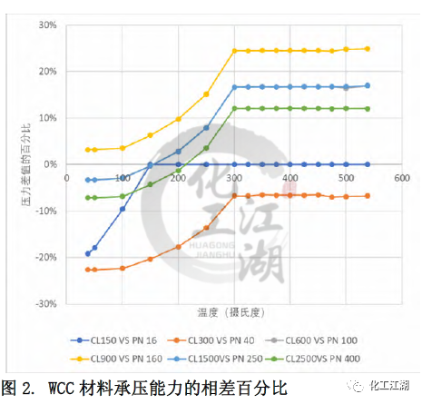 本文采用了對(duì)比冷(常溫)工作壓的方法來(lái)近似推算出與ASME標(biāo)準(zhǔn)Class壓力等級(jí)最鄰近的EN標(biāo)準(zhǔn)PN壓力等級(jí)。EN12516-1標(biāo)準(zhǔn)中列出的所有材料的冷工作壓都是相同的。而ASME B16.34標(biāo)準(zhǔn)中列出的冷工作壓和材料相關(guān),故選取了其中一種較強(qiáng)材料(C12A)的冷工作壓用于對(duì)比。 通過(guò)對(duì)比得到每個(gè)ASME標(biāo)準(zhǔn) Class壓力等級(jí)對(duì)應(yīng)的最鄰近的EN標(biāo)準(zhǔn) PN壓力等級(jí),見(jiàn)表1。同時(shí),這樣的對(duì)應(yīng)關(guān)系也和閥門(mén)設(shè)計(jì)的通用做法一致。本文的管道內(nèi)徑,最小壁厚,材料承壓能力的對(duì)比都是依照表1中的對(duì)應(yīng)關(guān)系來(lái)進(jìn)行的。 1.2 材質(zhì)承壓能力的對(duì)比 無(wú)論是ASME標(biāo)準(zhǔn)還是EN標(biāo)準(zhǔn)都列出了一些ASTM標(biāo)準(zhǔn)材料的壓力溫度等級(jí),即材料在不同溫度下的承壓能力。本文選取了常見(jiàn)的閥體材料:碳鋼WCC,合金鋼 WC9和C12A進(jìn)行研究,來(lái)對(duì)比兩個(gè)標(biāo)準(zhǔn)中相同材料在標(biāo)準(zhǔn)壓力等級(jí)下的承壓能力的差別。 圖1和圖 2顯示了WCC材料的溫度壓力曲線和Class與PN的對(duì)比,可以看出: (1)對(duì)于ASME的 Class 150和EN12516-1 的PN16,當(dāng)溫度低于150攝氏度時(shí),EN標(biāo)準(zhǔn)規(guī)定的材料承壓能力低于ASME標(biāo)準(zhǔn)規(guī)定的材料承壓能力,且隨著溫度升高,差距逐漸縮小。當(dāng)溫度高于150攝氏度時(shí),兩個(gè)標(biāo)準(zhǔn)對(duì)相同材料的承壓能力的規(guī)定近乎相同。 (2)對(duì)于ASME的 Class 300和EN12516-1 的PN40,在整個(gè)溫度的范圍內(nèi),EN標(biāo)準(zhǔn)規(guī)定的材料承壓能力均低于ASME標(biāo)準(zhǔn)規(guī)定的材料承壓能力。當(dāng)溫度低于300攝氏度時(shí),隨著溫度升高,差距逐漸縮小。當(dāng)溫度高于300攝氏度時(shí),兩個(gè)標(biāo)準(zhǔn)對(duì)相同材料的承壓能力的規(guī)定差別趨于一致,約為-7%。 (3)對(duì)于ASME的 Class 900和EN12516-1 的PN160, 在整個(gè)溫度的范圍內(nèi),EN標(biāo)準(zhǔn)規(guī)定的材料承壓能力均高于ASME標(biāo)準(zhǔn)規(guī)定的材料承壓能力。當(dāng)溫度低于300攝氏度時(shí),隨著溫度升高,差距越來(lái)越大。當(dāng)溫度高于300攝氏度時(shí),兩個(gè)標(biāo)準(zhǔn)對(duì)相同材料的承壓能力的規(guī)定差別趨于一致,約為24%。 (4)還有一點(diǎn)值得注意的,除了PN16,其他PN壓力等級(jí)對(duì)應(yīng)的工作壓力在低于300攝氏度以下都是一樣的,而ASME等級(jí)對(duì)應(yīng)的工作壓力是隨著溫度升高持續(xù)下降的。 1.3 對(duì)閥體設(shè)計(jì)的指導(dǎo) 在實(shí)際設(shè)計(jì)過(guò)程中,無(wú)論是為了縮短新產(chǎn)品推向市場(chǎng)的時(shí)間,還是從產(chǎn)品標(biāo)準(zhǔn)化、成本優(yōu)化的角度去考慮,盡可能多地將已有的設(shè)計(jì)或者零部件(尤其是需要開(kāi)發(fā)鑄造模具的閥體)應(yīng)用到新的產(chǎn)品中,都是設(shè)計(jì)師不可避免要考慮的問(wèn)題,可以采用同一個(gè)閥體鑄件的設(shè)計(jì)來(lái)滿足ASME 標(biāo)準(zhǔn)和EN標(biāo)準(zhǔn)的要求呢?為了解答這個(gè)問(wèn)題,本文選取了三個(gè)不同壓力等級(jí)-低、中、高的十二個(gè)具體實(shí)例,各項(xiàng)參數(shù)的對(duì)比結(jié)果如表3 所示。 (1)低壓ASME Class 300與 EN PN40 從表3中差別的百分?jǐn)?shù)可以看出,在兩個(gè)尺寸下,滿足ASME標(biāo)準(zhǔn)和EN 標(biāo)準(zhǔn)的管道內(nèi)徑和最小壁厚的差別,均小于5%。就是說(shuō),用同一個(gè)閥體設(shè)計(jì)來(lái)滿足兩個(gè)標(biāo)準(zhǔn)的設(shè)計(jì)要求是可以接受的。同時(shí)從圖2中可以看出,閥體常見(jiàn)材料在這兩個(gè)等級(jí)的承壓能力差別也較小,10%以內(nèi)。因此,兩個(gè)設(shè)計(jì)可以在類似的實(shí)際工況中應(yīng)用。 (2)中壓ASME Class 900與 EN PN160 對(duì)于中壓下尺寸為DN100和DN200的兩組設(shè)計(jì),從差別的百分?jǐn)?shù)可以看出,雖然每組中要對(duì)比的兩個(gè)設(shè)計(jì)的管道內(nèi)徑非常接近,但是所要求的最小壁厚卻相差較多,超過(guò)了20%。在這種情況下,實(shí)踐中也是可以用同一個(gè)閥體設(shè)計(jì)來(lái)滿足兩個(gè)標(biāo)準(zhǔn)的設(shè)計(jì)要求的,但是需要評(píng)估由此帶來(lái)的對(duì)最小壁厚要求較小的閥體的成本的影響。另一方面,從圖2中可以看出,閥體常見(jiàn)材料在這兩個(gè)等級(jí)的承壓能力差別較大,在有些溫度下差別達(dá)到20%。這種材料承壓能力上的差別和最小壁厚的差別是一致的。 (3)高壓ASME Class 2500與EN PN400 對(duì)于高壓下尺寸為DN100和DN200,閥門(mén)的管道內(nèi)徑和最小壁厚存在著巨大差別,30%-50%,故采用同一個(gè)閥體設(shè)計(jì)來(lái)滿足兩個(gè)標(biāo)準(zhǔn)的設(shè)計(jì)要求是不合理的。 還有另外一個(gè)因素需要在閥體設(shè)計(jì)時(shí)考慮,那就是閥體兩個(gè)端口之間的長(zhǎng)度。ASME B16.34中指出可以按照ASME B16.10來(lái)確定端口對(duì)端口尺寸。EN12516-1 并未提及端口對(duì)端口尺寸,但歐標(biāo)體系中EN558規(guī)定了端口對(duì)端口的尺寸??紤]到端口對(duì)端口尺寸并非標(biāo)準(zhǔn)強(qiáng)制要求,故本文未