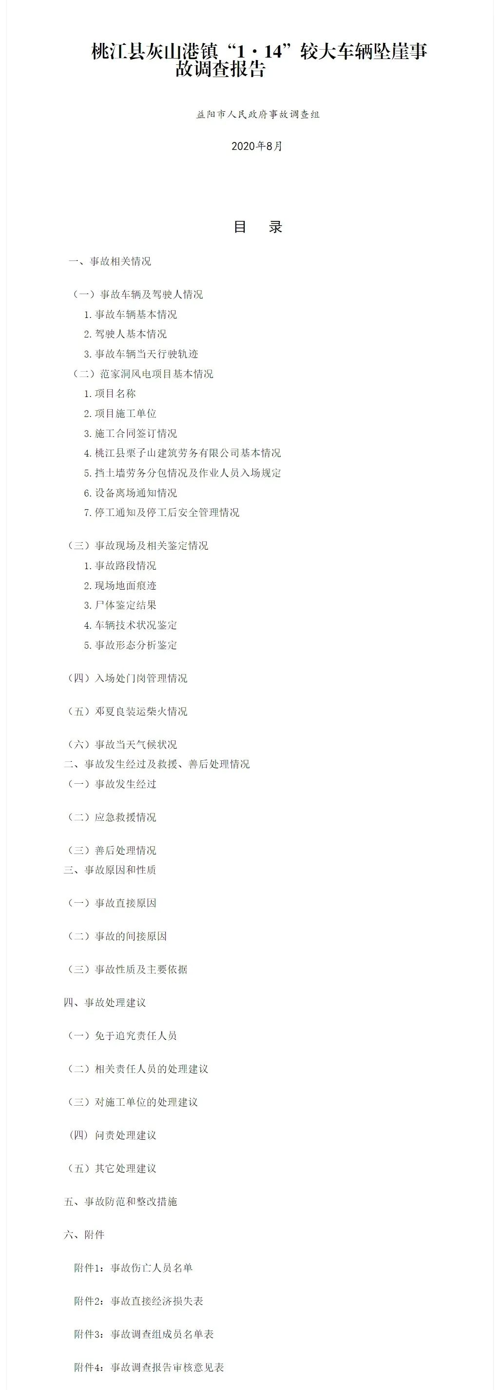 9月18日,湖南益陽市應(yīng)急管理局發(fā)布桃江縣灰山港鎮(zhèn)“1·14”較大車輛墜崖事故調(diào)查報告。事故為2020年1月14日17時10分許,在桃江縣灰山港鎮(zhèn)范家洞風(fēng)電項目場內(nèi)道路5-1#主干道18#機(jī)位處發(fā)生一起車輛墜崖事故,導(dǎo)致5人死亡,車輛受損報廢,直接經(jīng)濟(jì)損失約528萬元。報告原文如下: