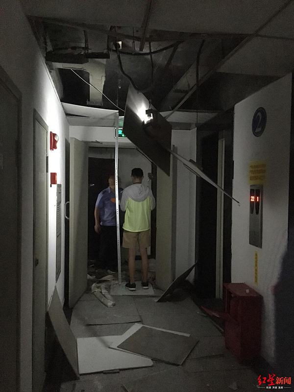業(yè)主們紛紛跑出門(mén),發(fā)現(xiàn)該住宅樓二樓的過(guò)道上,天花板垮了一地,門(mén)板、玻璃倒落在地上,二樓一住戶家中門(mén)開(kāi)著,爆炸聲由此傳出?!耙晃蛔艉鸵晃槐0彩芰藗?,馬上打120送去了醫(yī)院?!币晃蛔舴Q。