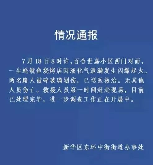 據(jù)通報(bào)顯示,7月18日上午8時(shí)左右,百合世嘉小區(qū)西門對面,一生蠔魷魚燒烤店因液化氣泄漏發(fā)生閃爆起火。