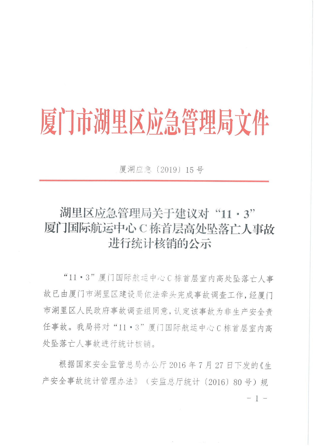 湖里區(qū)應(yīng)急管理局關(guān)于建議對(duì)“11·3”廈門國(guó)際航運(yùn)中心C棟首層高處墜落亡人事故進(jìn)行統(tǒng)計(jì)核銷的公示
