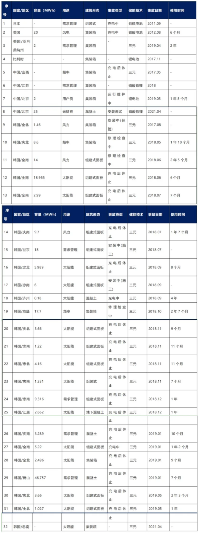 近10年間,全球共發(fā)生32起儲能電站起火爆炸事故。其中,日本1起、美國2起、比利時1起、中國3起、韓國24起。通過對行業(yè)公開信息進行搜集整理,匯總了2011-2021年間,全球儲能項目主要火災或爆炸事故。由于較多安全事故原因復雜,相關(guān)事件很多都未公開披露。