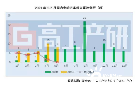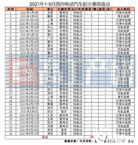 根據(jù)公告資料不完全統(tǒng)計(jì),2021年1-5月國(guó)內(nèi)共發(fā)生電動(dòng)汽車(chē)起火事故34起,較去年同期增加20起;涉及車(chē)輛數(shù)目38輛,較去年同期增長(zhǎng)73%,隨著國(guó)內(nèi)電動(dòng)汽車(chē)保有量的快速增長(zhǎng),起火事故備受業(yè)內(nèi)關(guān)注。