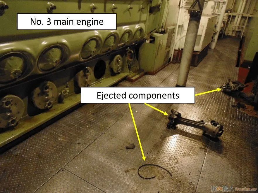 在煙霧開(kāi)始消散,主機(jī)周邊降溫后,船員認(rèn)為沒(méi)有必要使用消防水槍或二氧化碳消防系統(tǒng)。在“Wenatchee”號(hào)安全抵達(dá)泊位后,工程師再次進(jìn)入機(jī)艙,并發(fā)現(xiàn)三號(hào)發(fā)動(dòng)機(jī)旁邊散落的一些破損部件,包括連桿和一部分活塞。