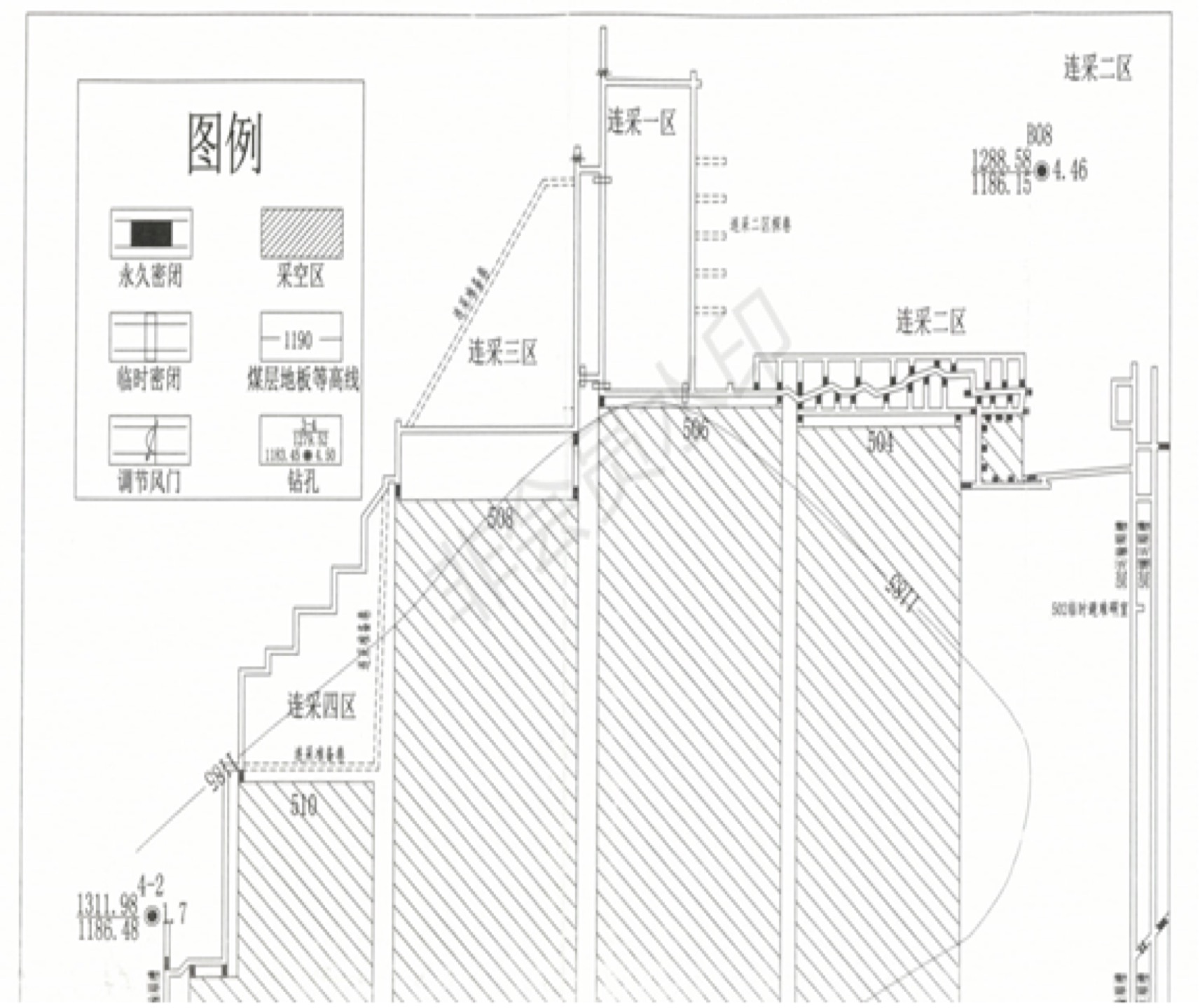 采煤機(jī)回采504、506、508、510綜采工作面采空區(qū)以南邊角煤,分為4個(gè)區(qū)(如圖2)。一區(qū)為506連采工作面,位于506綜采工作面以南。二區(qū)為連采探巷工作面,位于506和504綜采工作面以南、一區(qū)進(jìn)風(fēng)順槽以西邊角區(qū)域,采用在一區(qū)進(jìn)風(fēng)順槽向西探巷式掘進(jìn),后退式單翼采硐回采,局扇供風(fēng),爆破強(qiáng)制放頂,全部垮落法管理頂板。三、四區(qū)分別位于508、510綜采工作面以南邊角區(qū)域。
