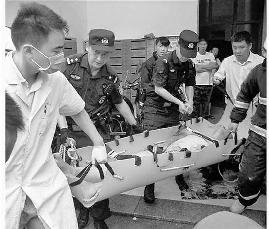 情況危急,消防隊員與PTU隊員合力將受傷男子抬上擔(dān)架,由120急救車送往醫(yī)院救治。