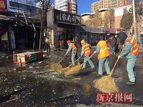 環(huán)衛(wèi)工正在清理爆燃時(shí)散落的玻璃碎片。新京報(bào)記者王飛攝