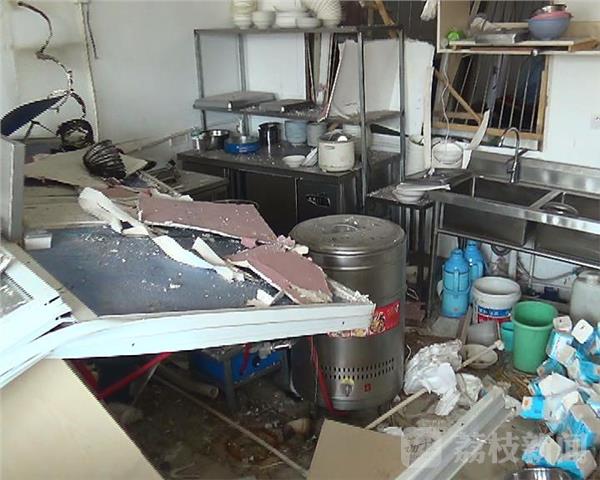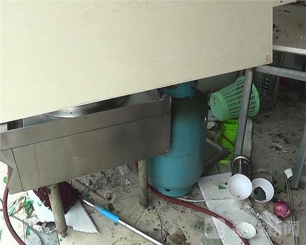 記者現(xiàn)場看到工人正在拆卸樓上被炸碎裂的玻璃窗戶,樓下全是窗戶玻璃碎片,爆炸的牛肉面館和隔壁的房東餃面飼料店里一片狼藉,隔壁移動公司和一個煙酒店玻璃窗戶和門牌也被炸碎裂和損壞。記者進(jìn)入餃面店發(fā)現(xiàn),里面操作臺旁邊還有煤氣瓶,房頂砸脫落熏黑,房東房間窗戶也被炸彎曲變形,隔壁房東的店鋪里面也是狼藉一片,整袋的米和飼料包裝袋被砸損。大門也被砸壞。