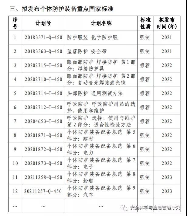 一、總體要求 深入學(xué)習(xí)貫徹習(xí)近平總書(shū)記“把人民群眾生命安全和身體健康放在第一位”的重要指示精神,落實(shí)《國(guó)家標(biāo)準(zhǔn)化發(fā)展綱要》,實(shí)施公共安全標(biāo)準(zhǔn)化筑底工程,堅(jiān)持人民至上、生命至上,聚焦重點(diǎn)行業(yè)、重點(diǎn)產(chǎn)品,加大標(biāo)準(zhǔn)研制工作進(jìn)度,充分發(fā)揮標(biāo)準(zhǔn)引領(lǐng)帶動(dòng)作用,推動(dòng)個(gè)體防護(hù)裝備質(zhì)量與安全水平持續(xù)提升,推動(dòng)生產(chǎn)經(jīng)營(yíng)單位嚴(yán)格按照國(guó)家標(biāo)準(zhǔn)要求配備個(gè)體防護(hù)裝備,為維護(hù)勞動(dòng)者安全健康權(quán)益提供更加有力支撐。 到2023年底,個(gè)體防護(hù)裝備標(biāo)準(zhǔn)體系進(jìn)一步完善,重點(diǎn)個(gè)體防護(hù)裝備產(chǎn)品標(biāo)準(zhǔn)水平持續(xù)提升,主要性能指標(biāo)與國(guó)際、國(guó)外發(fā)達(dá)國(guó)家保持基本一致,個(gè)體防護(hù)裝備國(guó)際標(biāo)準(zhǔn)取得重點(diǎn)突破。推出一批重點(diǎn)行業(yè)個(gè)體防護(hù)裝備配備標(biāo)準(zhǔn),配備標(biāo)準(zhǔn)對(duì)生產(chǎn)經(jīng)營(yíng)單位個(gè)體防護(hù)裝備的規(guī)范作用初步顯現(xiàn)。重點(diǎn)個(gè)體防護(hù)裝備質(zhì)量監(jiān)督抽查,重點(diǎn)行業(yè)、領(lǐng)域個(gè)體防護(hù)裝備配備的執(zhí)法檢查得到有效開(kāi)展,個(gè)體防護(hù)裝備標(biāo)準(zhǔn)管理、產(chǎn)品生產(chǎn)、檢驗(yàn)檢測(cè)、配備使用及實(shí)施反饋的閉環(huán)機(jī)制基本形成。個(gè)體防護(hù)裝備標(biāo)準(zhǔn)化助力行業(yè)高質(zhì)量發(fā)展,保障勞動(dòng)者生命安全和身體健康的作用進(jìn)一步凸顯。 二、重點(diǎn)任務(wù) (一)集中發(fā)布實(shí)施一批個(gè)體防護(hù)裝備國(guó)家標(biāo)準(zhǔn)。 加大個(gè)體防護(hù)裝備領(lǐng)域國(guó)家標(biāo)準(zhǔn)的有效供給,逐步建立健全個(gè)體防護(hù)裝備標(biāo)準(zhǔn)體系。在已有石化、冶金、有色、礦山等領(lǐng)域個(gè)體防護(hù)配備標(biāo)準(zhǔn)的基礎(chǔ)上再重點(diǎn)選取建材、電子、電力等急需短缺行業(yè)、領(lǐng)域,從個(gè)體防護(hù)裝備的配備原則、配備程序、配備基本要求、判廢和更換、培訓(xùn)和使用等方面,制定發(fā)布一批個(gè)體防護(hù)裝備配備強(qiáng)制性國(guó)家標(biāo)準(zhǔn),為高危行業(yè)從業(yè)人員的個(gè)體防護(hù)裝備配備管理提供執(zhí)法和監(jiān)管依據(jù)。對(duì)標(biāo)國(guó)際先進(jìn)標(biāo)準(zhǔn),集中推出一批個(gè)體防護(hù)裝備產(chǎn)品和檢測(cè)相關(guān)推薦性國(guó)家標(biāo)準(zhǔn),以標(biāo)準(zhǔn)引領(lǐng)我國(guó)個(gè)體防護(hù)相關(guān)產(chǎn)品質(zhì)量安全水平持續(xù)提升。在呼吸防護(hù)、防護(hù)服裝等領(lǐng)域,牽頭提出國(guó)際標(biāo)準(zhǔn)項(xiàng)目提案,推動(dòng)我國(guó)個(gè)體防護(hù)裝備國(guó)際標(biāo)準(zhǔn)取得新突破。 (二)深入開(kāi)展標(biāo)準(zhǔn)宣傳和培訓(xùn)。 采取集中宣貫為主,培訓(xùn)、調(diào)研為輔的形式,組織全國(guó)個(gè)體防護(hù)裝備標(biāo)準(zhǔn)化技術(shù)委員會(huì)等相關(guān)單位,面向生產(chǎn)企業(yè)、檢測(cè)機(jī)構(gòu)和生產(chǎn)經(jīng)營(yíng)單位進(jìn)行全方位、多層次、有針對(duì)性的宣貫培訓(xùn),按年度制定并發(fā)布標(biāo)準(zhǔn)宣貫計(jì)劃。引導(dǎo)廣大生產(chǎn)企業(yè)“學(xué)標(biāo)、用標(biāo)、對(duì)標(biāo)”,加快企業(yè)技術(shù)更新,推動(dòng)產(chǎn)品升級(jí)換代。開(kāi)展“個(gè)體防護(hù)裝備標(biāo)準(zhǔn)進(jìn)基層,筑牢最后一道防線(xiàn)”系列活動(dòng),推動(dòng)生產(chǎn)經(jīng)營(yíng)單位按需求購(gòu)買(mǎi)、按標(biāo)準(zhǔn)配備、按工種佩戴。 (三)強(qiáng)化個(gè)體防護(hù)裝備質(zhì)量安全監(jiān)管。 統(tǒng)籌做好生產(chǎn)和流通領(lǐng)域個(gè)體防護(hù)裝備的質(zhì)量監(jiān)督抽查,以問(wèn)題為導(dǎo)向,突出抽查重點(diǎn)產(chǎn)品和重點(diǎn)領(lǐng)域,繼續(xù)加大非醫(yī)用口罩等防護(hù)裝備,以及安全網(wǎng)、安全帽等與安全生產(chǎn)密切相關(guān)的防護(hù)裝備的監(jiān)督抽查力度。力爭(zhēng)用3年時(shí)間,清理一批違法違規(guī)生產(chǎn)銷(xiāo)售產(chǎn)品,查處一批違法大案要案,解決一批質(zhì)量安全突出問(wèn)題,全面提升個(gè)體防護(hù)裝備質(zhì)量水平。 (四)加強(qiáng)個(gè)體防護(hù)裝備產(chǎn)品的認(rèn)證認(rèn)可有效供給。 建立適合個(gè)體防護(hù)裝備及相關(guān)領(lǐng)域的質(zhì)量認(rèn)證制度體系,促進(jìn)新技術(shù)、新產(chǎn)品、新業(yè)態(tài)的成熟應(yīng)用。在個(gè)體防護(hù)裝備領(lǐng)域支持一批技術(shù)有特長(zhǎng)、服務(wù)有特色的專(zhuān)業(yè)檢驗(yàn)檢測(cè)認(rèn)證機(jī)構(gòu)發(fā)展,不斷滿(mǎn)足市場(chǎng)多樣化、個(gè)性化需求。加強(qiáng)能力驗(yàn)證制度在個(gè)體防護(hù)裝備檢測(cè)領(lǐng)域的應(yīng)用,幫助相關(guān)檢驗(yàn)檢測(cè)機(jī)構(gòu)提升技術(shù)能力和人員水平。對(duì)標(biāo)國(guó)際,促進(jìn)個(gè)體防護(hù)裝備產(chǎn)品領(